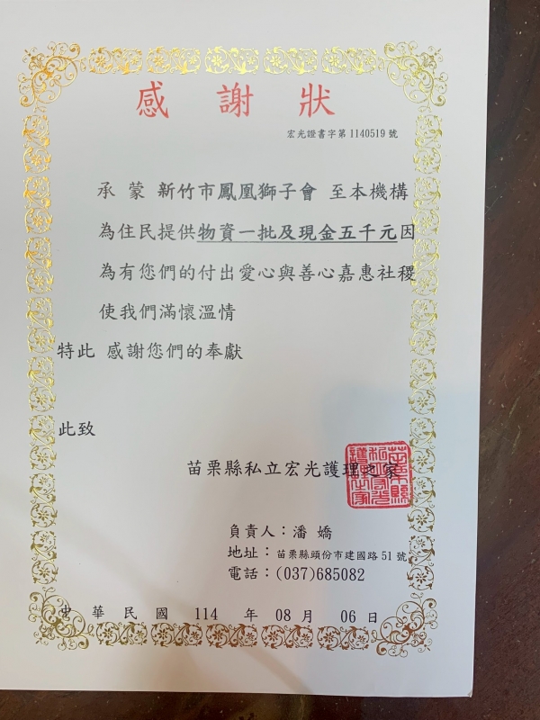 關還宏光護理之家 捐贈物資一批及社服金5千元