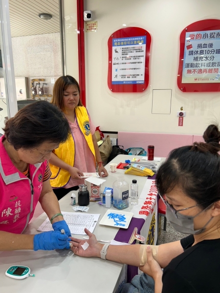 |2024-07-02 於西大路捐血中心舉辦捐血活動及血糖檢測活動 感謝林金鉉會長賴領獅姐 陳甚秘書 孫月琴前會長 怡安會長 吳惠貴獅姊,感謝 捐血委員會主席顏妘蓁獅友 陳運鵬主席蒞臨指導 並贈送飲料,點心鼓勵。總計捐血114袋數 95位民眾參與血糖檢測。