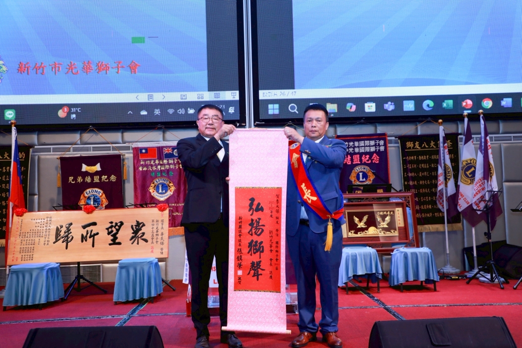 本會很榮幸榮任新竹光華獅子會第43屆會長,從此刻將是責任的開始,擔任會長是一項榮耀也是一份責任,未來我將延續著本會歷屆前會長的優良傳承,秉持獅子理念犧牲奉獻的精神,積極堆動會務,使本會會務更上一層樓,服務社會造福人群、協助弱勢。跟著2025-2026年300B 6區總監黃秀卿獅友的年度主題【卿力卿為、樂在服務】,只要有需要服務的地方,就有我們 子會的身影,更不辜負全體獅兄的託付與期許。